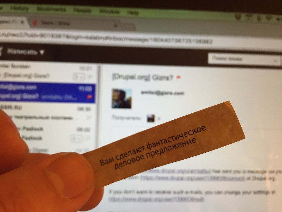 Вчера ночью я вскрыла заныканную печеньку с предсказанием, а там меня поджидало аж с самого Петербурга «фантастическое деловое предложение». Я ухмыльнулась. Вы меня видели? Пьяному сугробу сделают «фантастическое деловое предложение»! Интересно мне знать, какое.